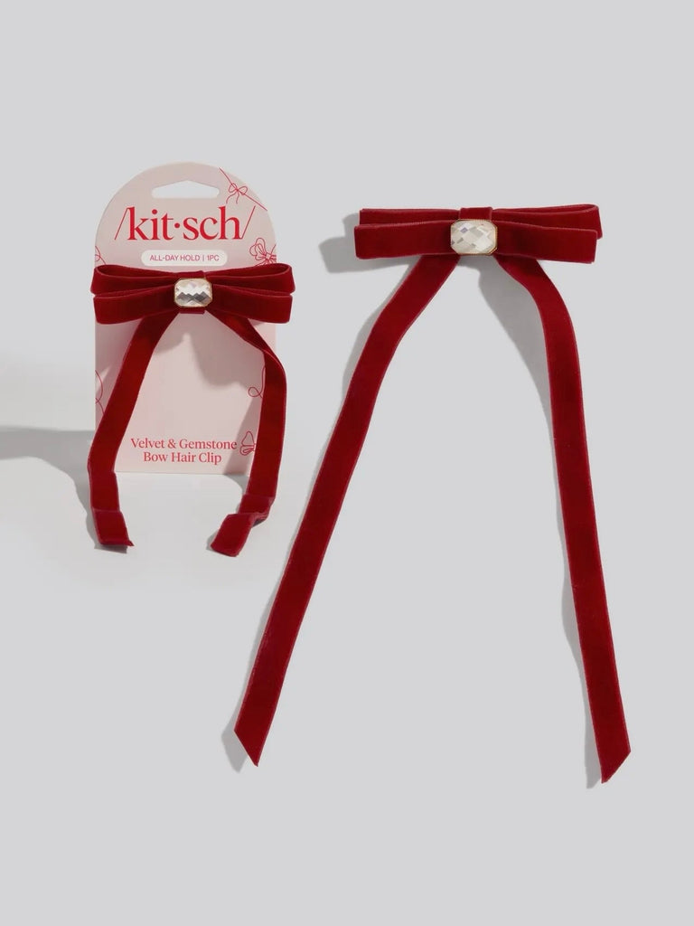 The Statement Clip of the Season Timeless charm meets modern sparkle with the Kitsch Velvet Gemstone Bow Hair Clip – Red. Crafted from plush red velvet and finished with a delicate gemstone accent, this bow clip adds instant elegance to any look—whether you're heading to a holiday soirée or just elevating your everyday. A touch of sparkle meets timeless charm—this Velvet Gemstone Bow Hair Clip is made to stand out.
