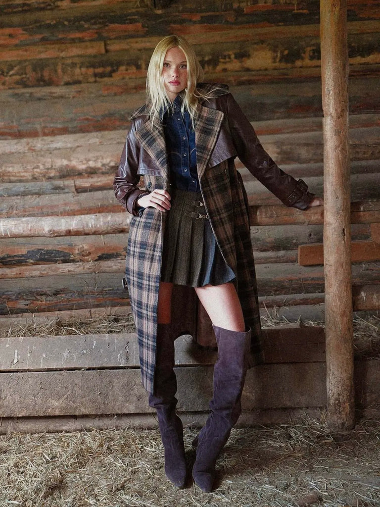 Rooted in heritage and steeped in collegiate charm, this plaid and faux leather trench is a study in timeless sophistication. Rich chocolate faux leather trims the shoulders and sleeves, while the longline plaid nods to vintage academia. Finished with a belted waist and tailored details, it’s a statement piece that feels at home on ivy-lined campuses, strolling through autumn libraries, or layered for weekend escapes to the countryside.