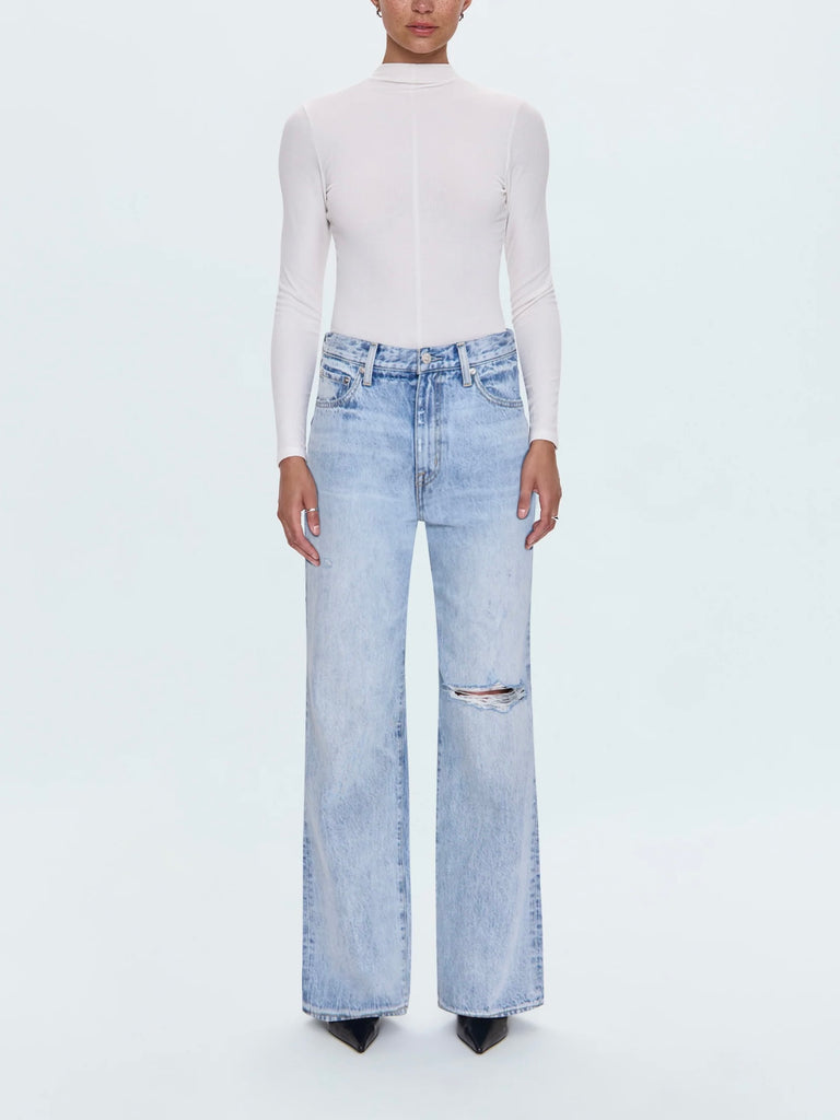 A relaxed fit with real character, Hendrix sits high at the waist with a full-length 31" inseam and an intentionally oversized silhouette that feels effortless yet refined. The structured shape maintains clean proportions, balancing ease with polish. Crafted from 100% cotton rigid denim in Revel Distressed, a light blue wash with subtle fading and distressing that captures the look of true vintage wear.