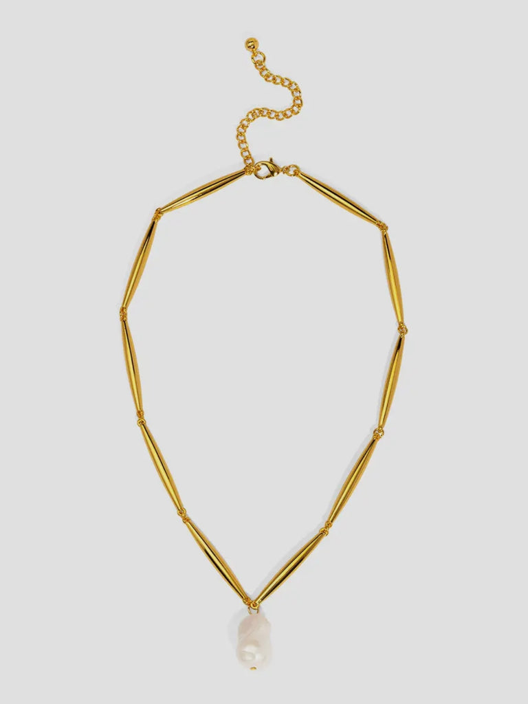 Short necklace featuring a spindle chain and a baroque pearl pendant.
