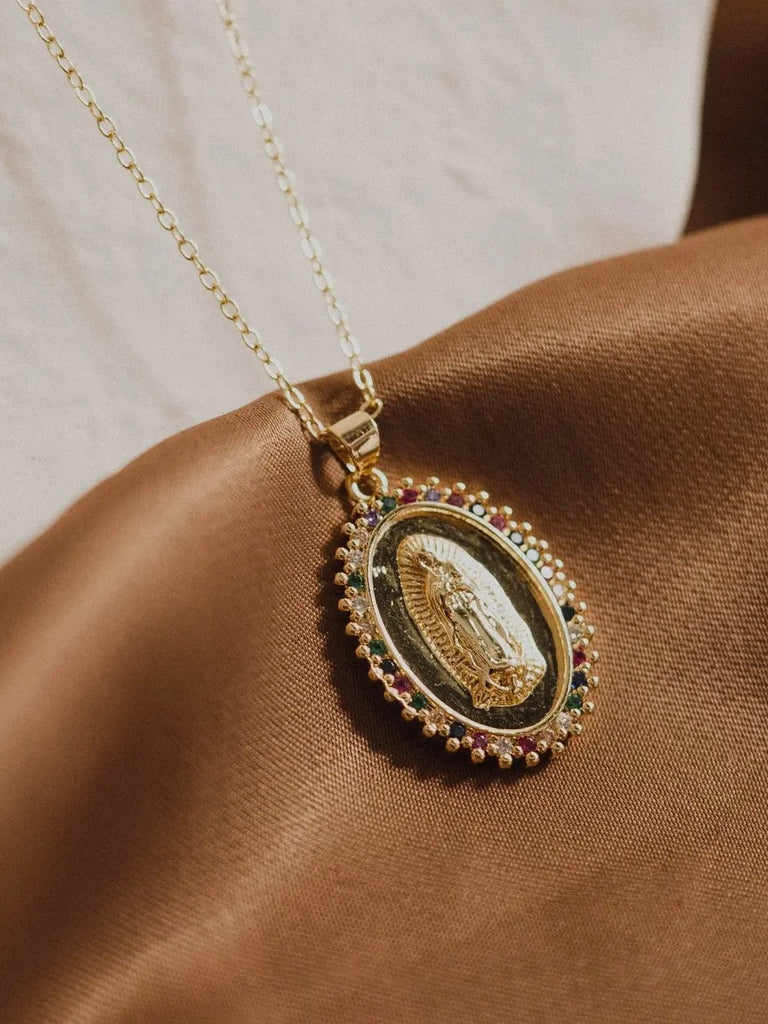 Dainty chain necklace with multi color rhinestones surround an oval Virgin Mary pendant.