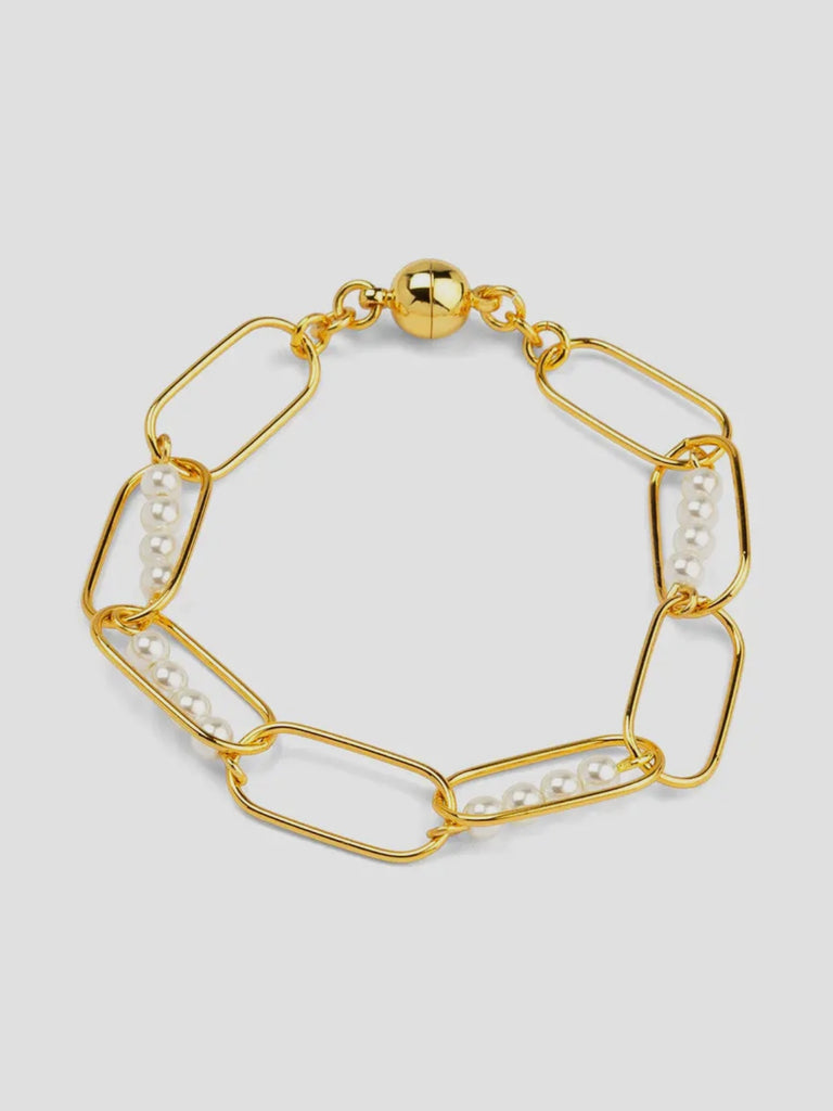 Magnet closure bracelet combining gold-tone elongated links with delicate strands of pearls.