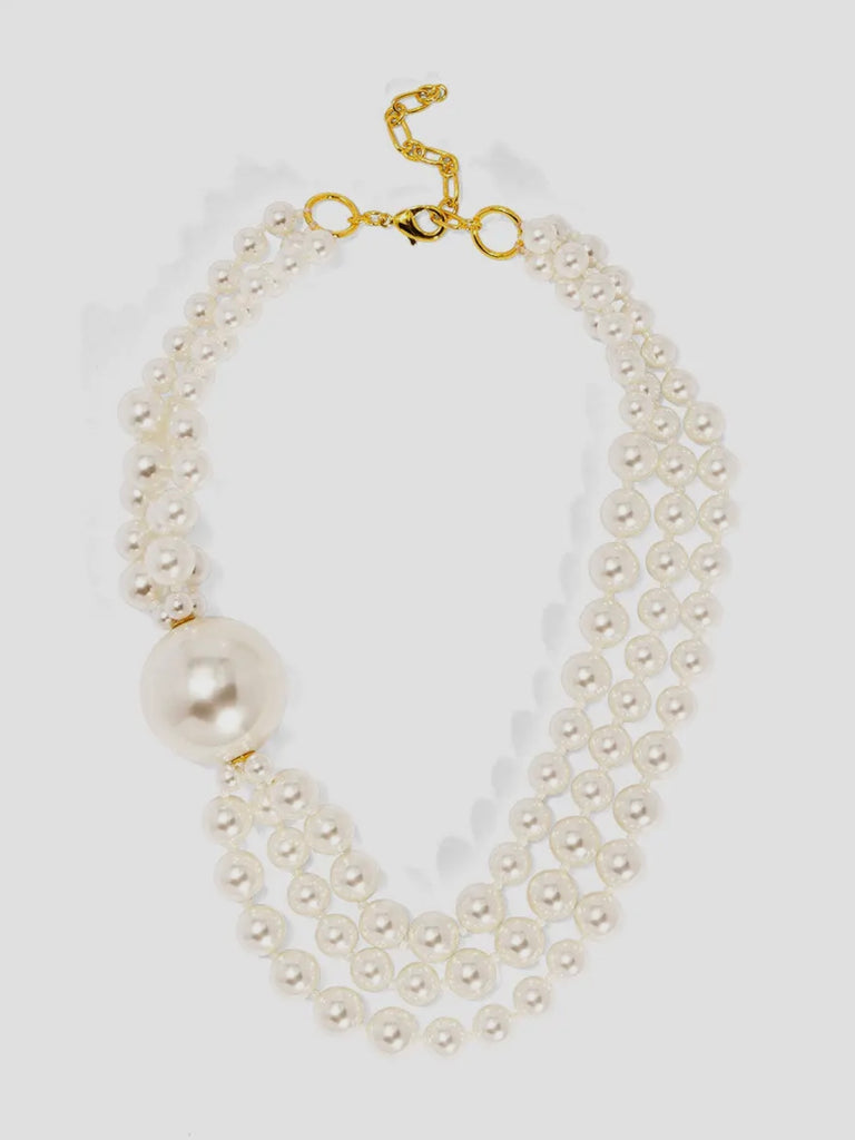 Collar necklace composed of pearlescent bead layers, accentuated with an oversized pearl, and completed with a lobster claw closure.