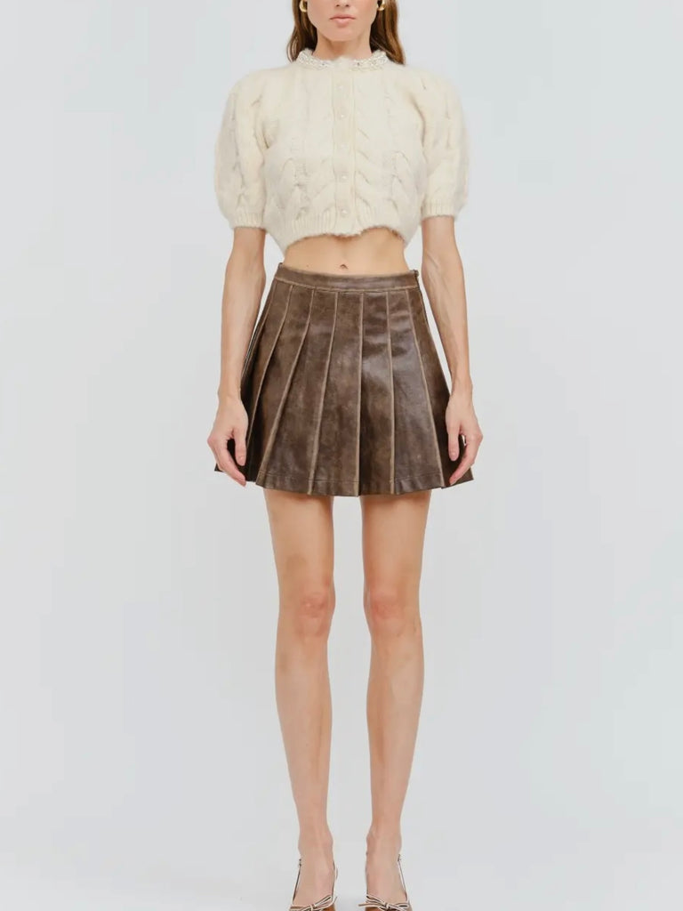 She's so sweet and even softer. This cropped sweater features a light puff sleeve and pearl and rhinestone collar detail.