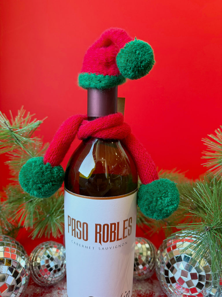 Bottle Hat & Scarf in Red & Green Pom