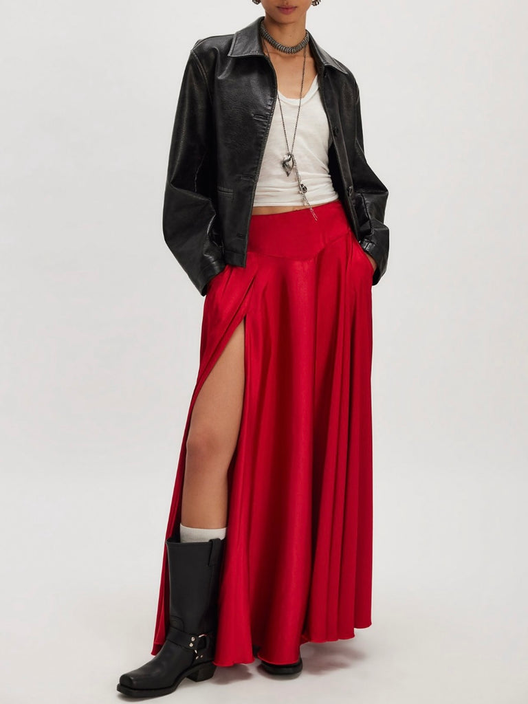 Stunning is an understatement for this satin maxi skirt, featured in a cascading A-line design with a pointed waistband for an extra elevated detail.