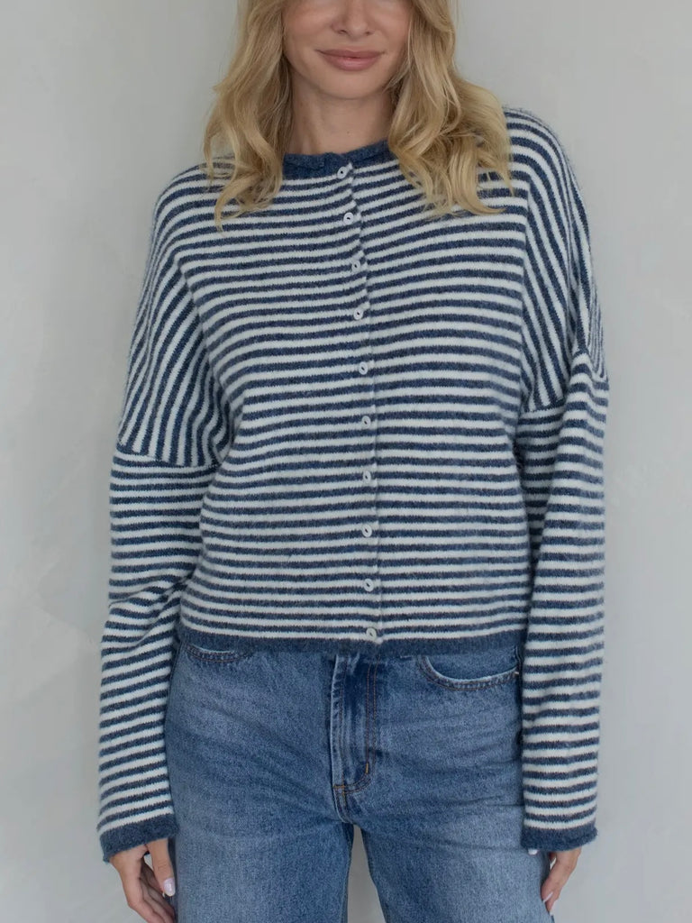 Soft and cozy lightweight cardigan with rolled edge finish on the sleeves and collar.