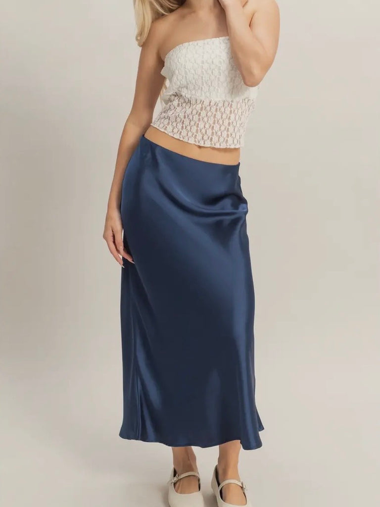 She's too cute. This midi skirt features a shiny finish and elastic waistband. Unlined.